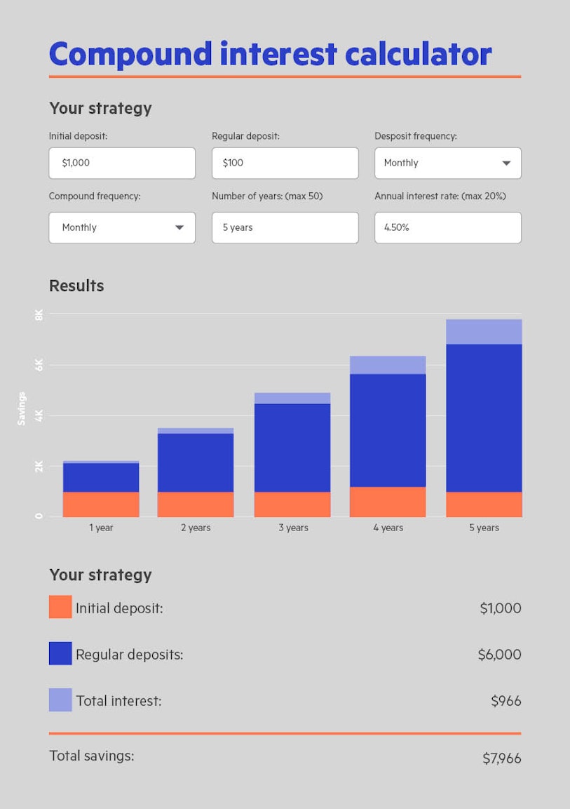 If you open a Bonus Saver account at a variable rate of 4.5%, (this includes a bonus rate of 4.45% plus a standard rate of 0.05%), with $1,000 as an initial deposit, making $100 regular monthly contributions then over 5 years you could earn approx. $966 in interest*.