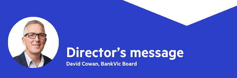 It is a privilege to be one of your directors on our 100% member-owned bank. The whole Board approaches every decision with you front of mind, and we thank you for your ongoing membership and support of BankVic.
